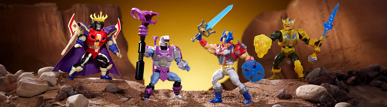The Masters of the Universe x Transformers line is a crossover action figure series that blends classic MOTU characters with Transformers-inspired armor and visual design. Built on the MOTU Origins platform, these figures retain the familiar 5.5-inch scale and articulation while reimagining Eternian heroes and villains through a Cybertronian lens. Instead of transformation mechanics, the focus is on character fusion, themed armor, and accessories that combine elements from both franchises.